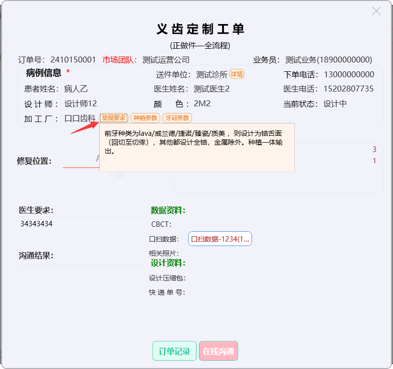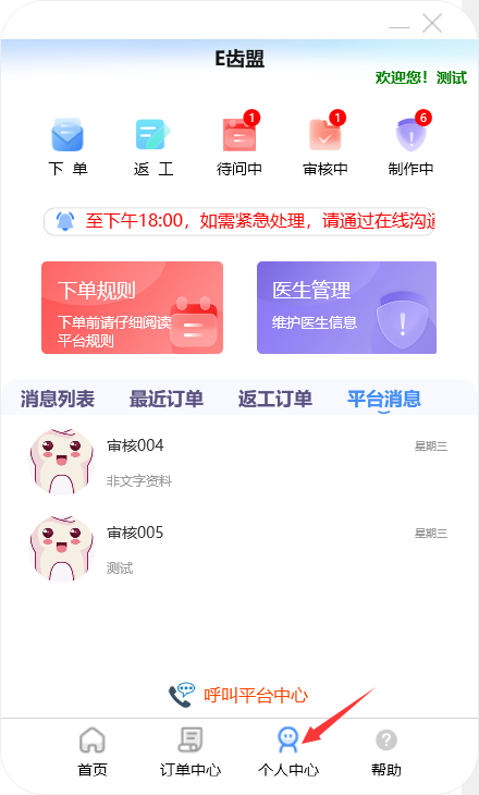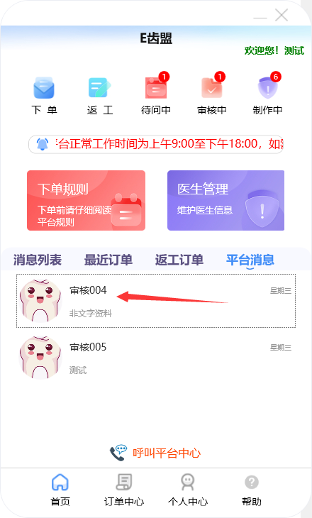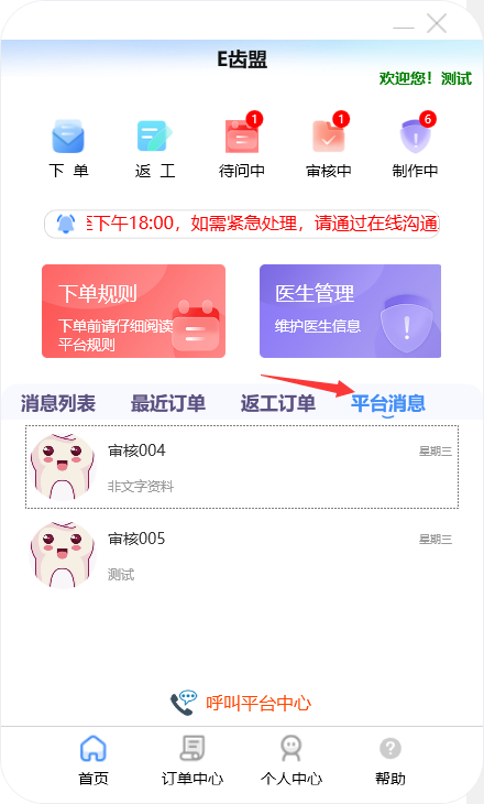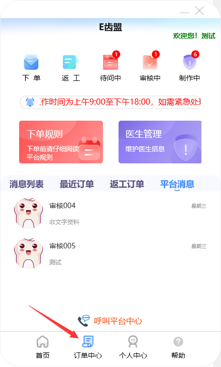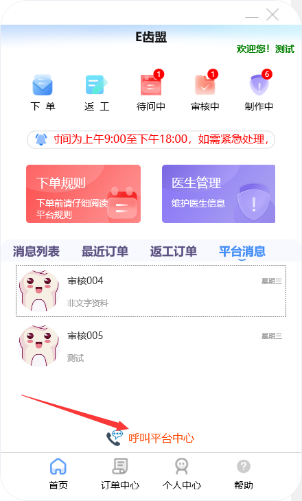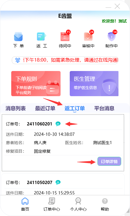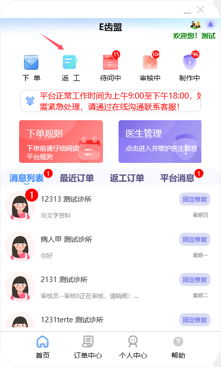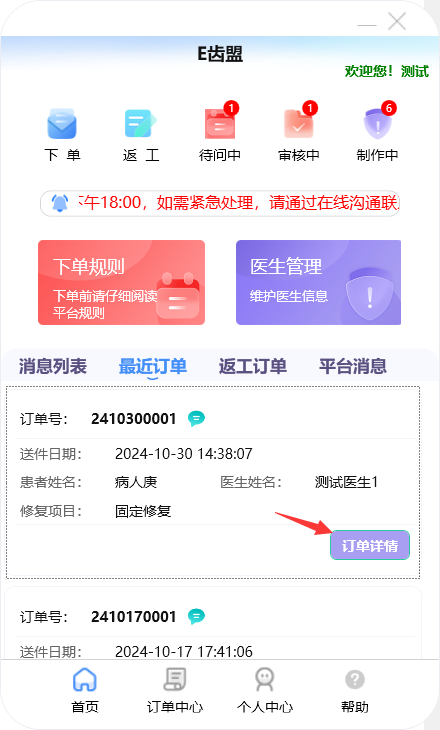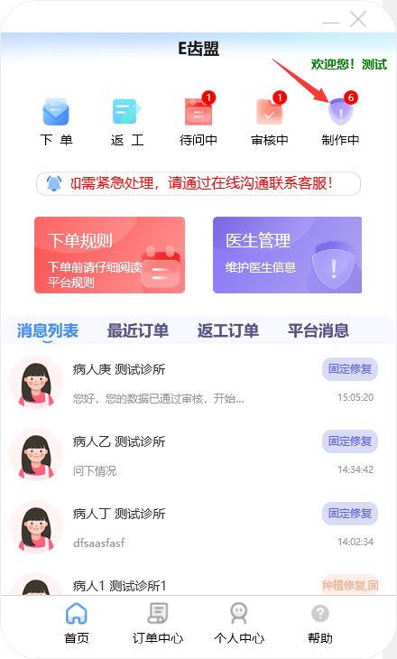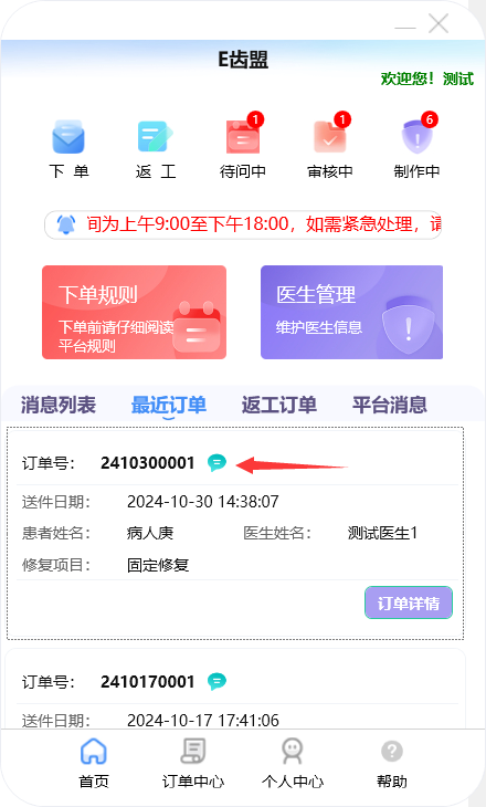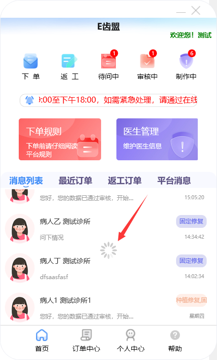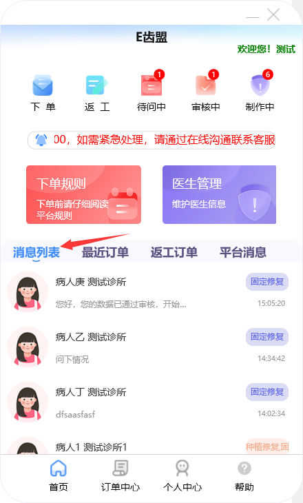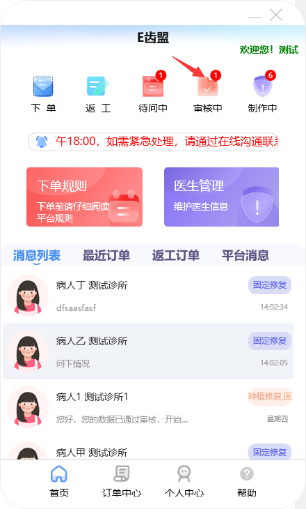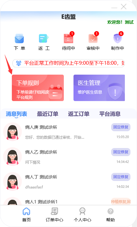 门户首页显示待问中、审核中、制作中的订单数量;查询系统公告;阅读下单规则;新建订单及下返工件;进行医生管理;查询订单消息;订单在线沟通、数字化会诊及呼叫平台中心等功能。