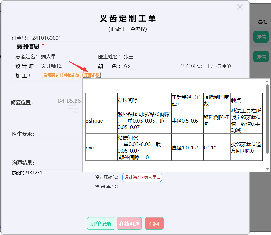 点击【牙冠参数】按钮,显示订单的牙冠参数。