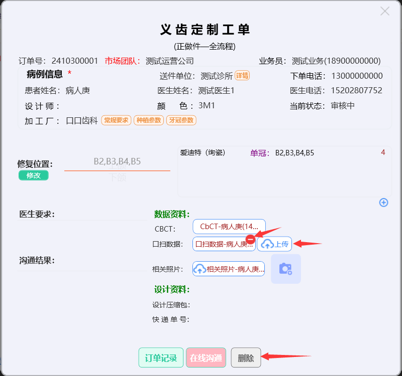 在这里需要录入医生要求及上传相关资料。删除已上传的资料时,将鼠标放在资料上面,系统会自动弹出红色的删除图标,点击即可删除重传。