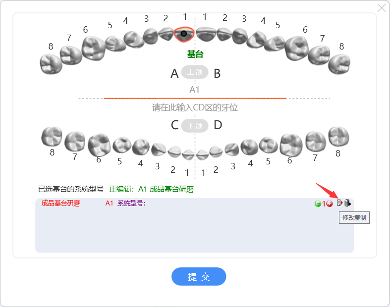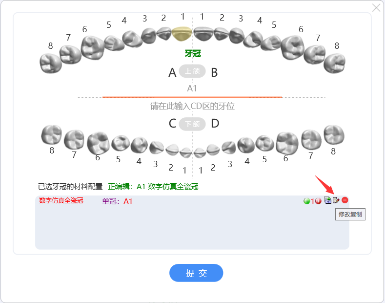 如若需修改某项记录,可点击修改牙位数量,也可将连冠的记录中排除某牙位以及将该行记录修改或复制。