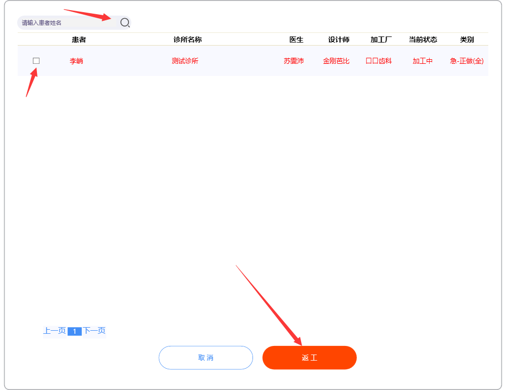 录入患者姓名点击搜索图标,选择好返工患者记录。