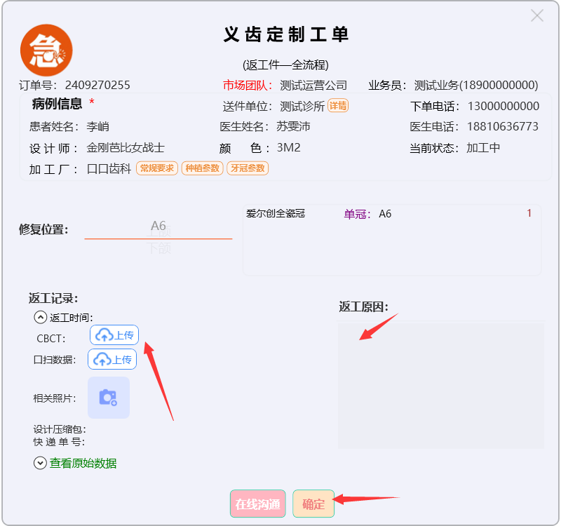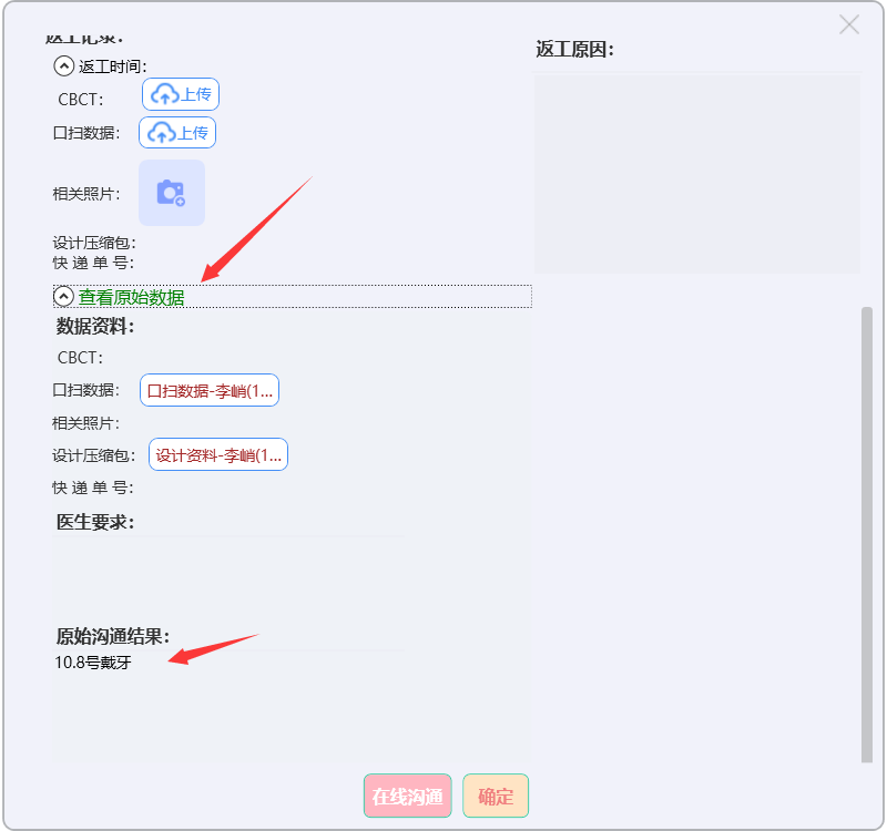 录入返工原因,上传口扫数据等,点击【确定】,保存即可。点击【查看原始数据】,可查询原始数据: