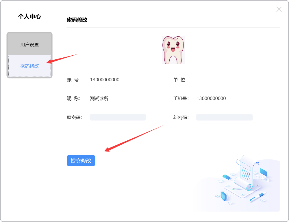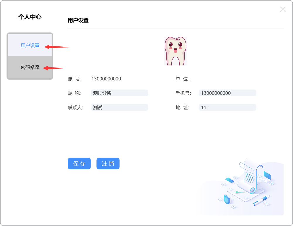 进入个人中心设置页面,可以进行用户设置及密码修改操作: