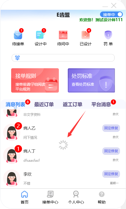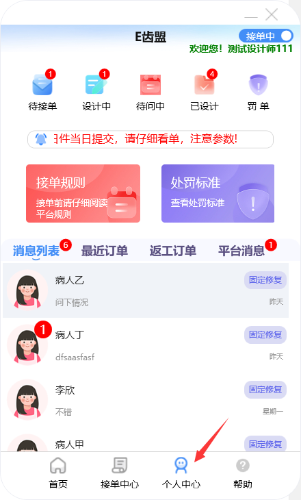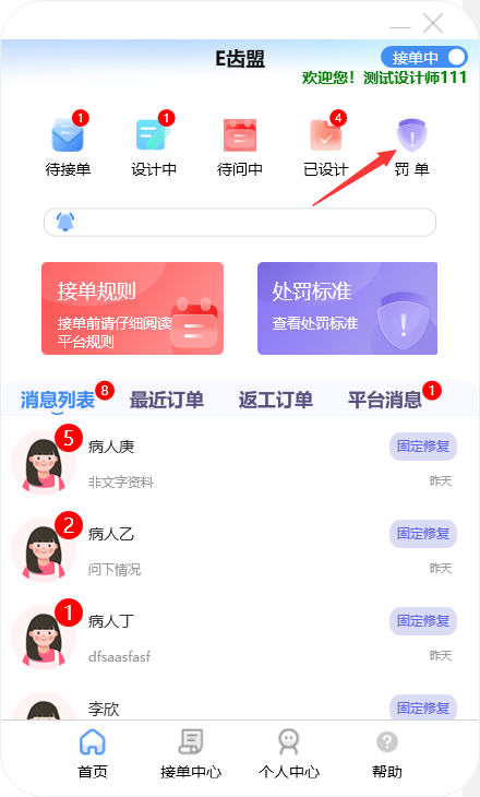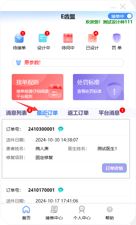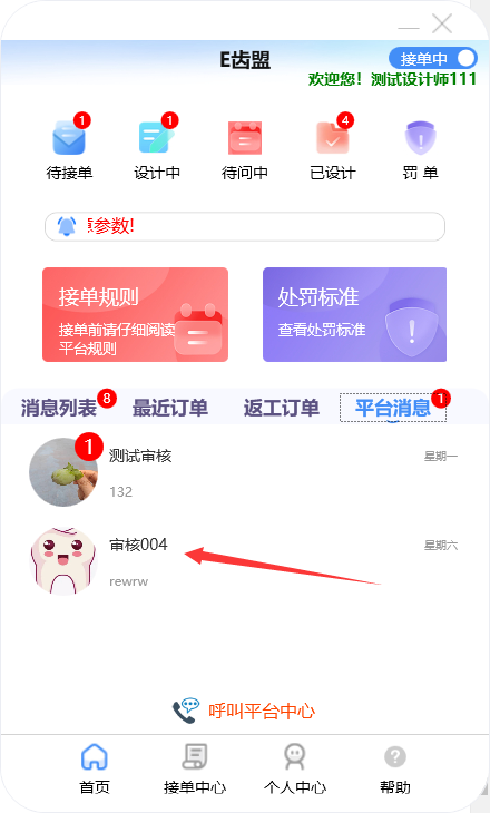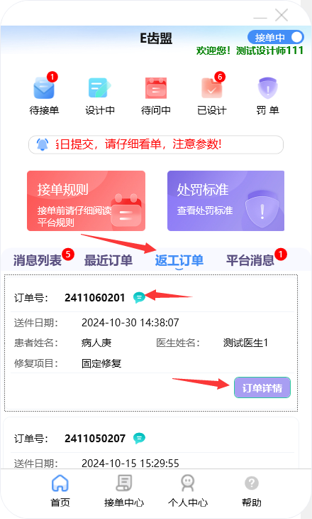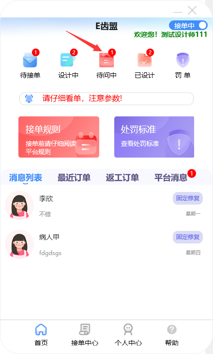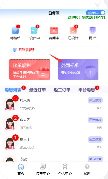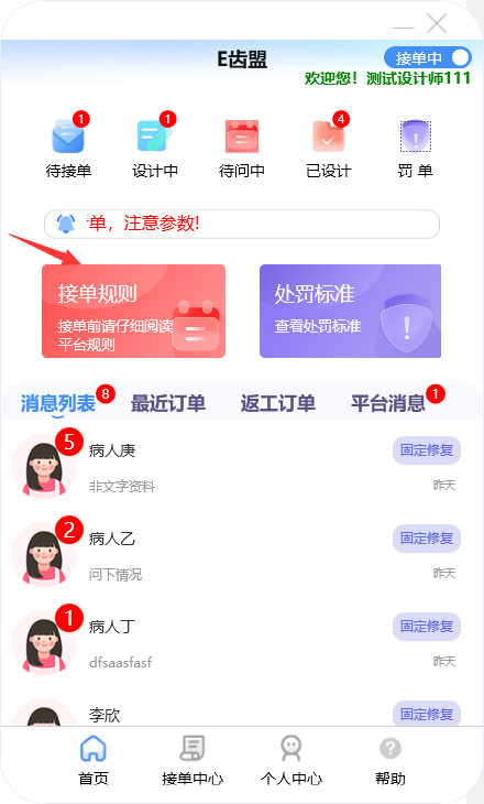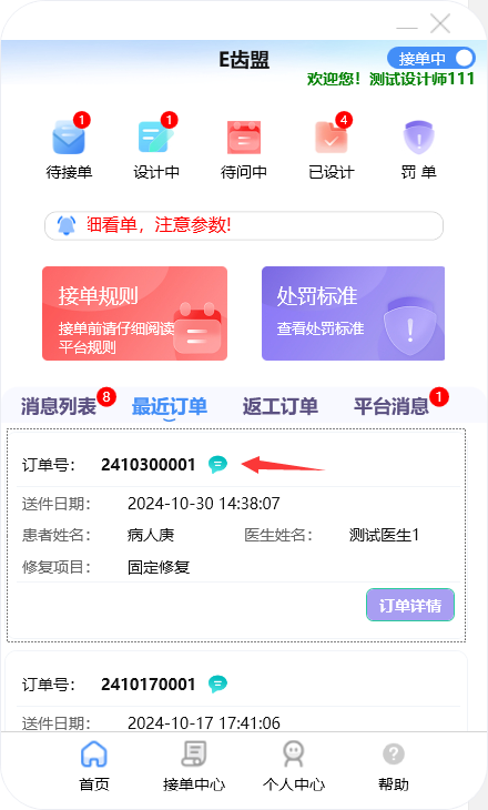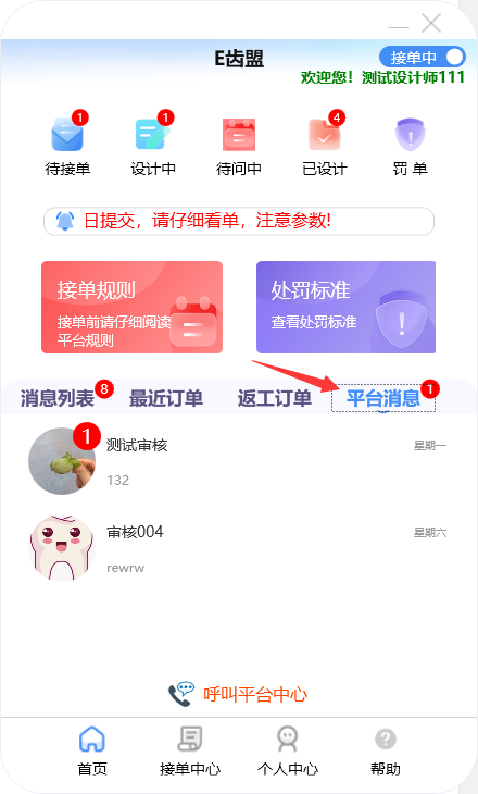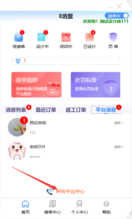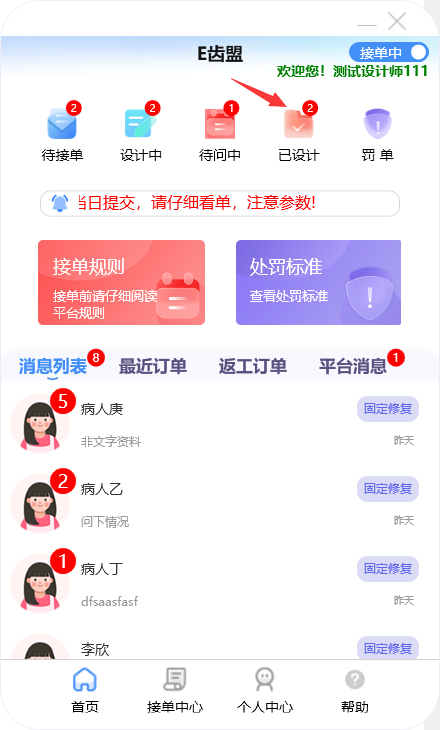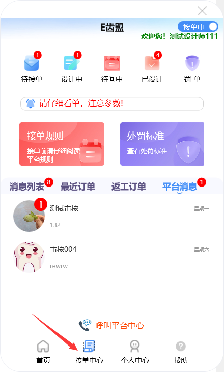 门户首页显示待接单、设计中、待问中、已设计的订单数量;查询系统公告;阅读接单规则及处罚标准;新建订单及下返工件;进行罚单查询;查询订单消息;订单在线沟通及呼叫平台中心等功能。
