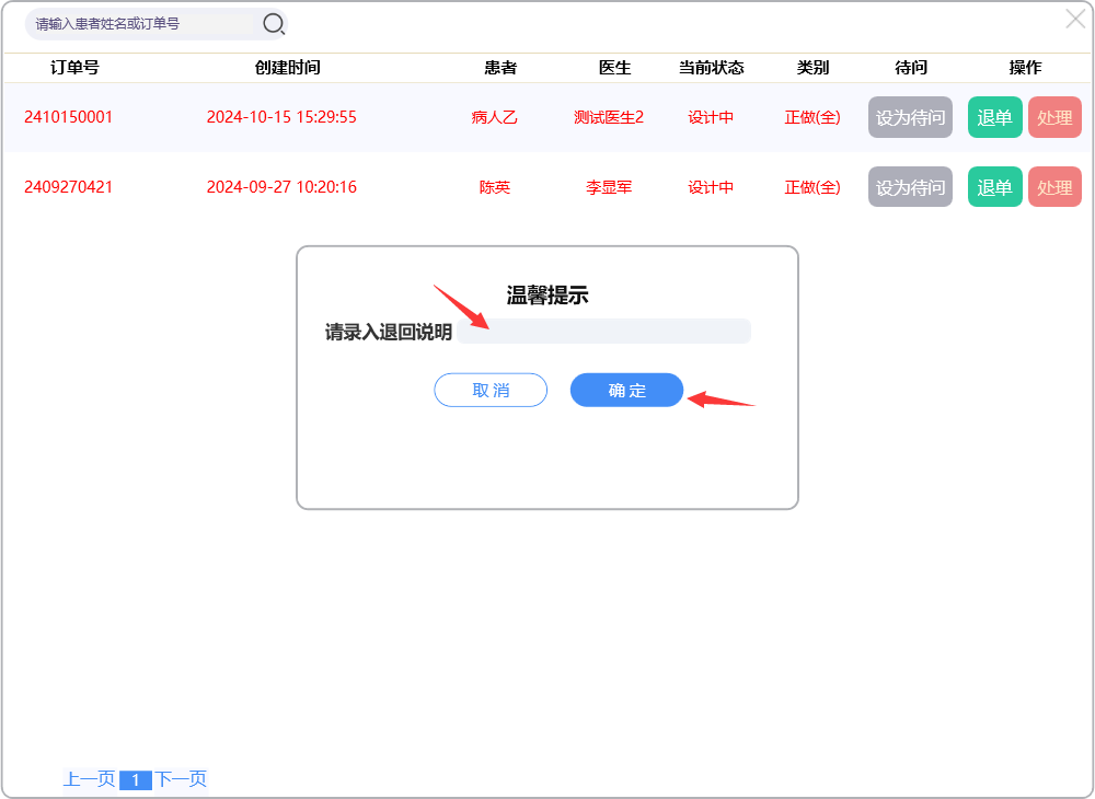 点击【退单】按钮,需要录入退单原因: