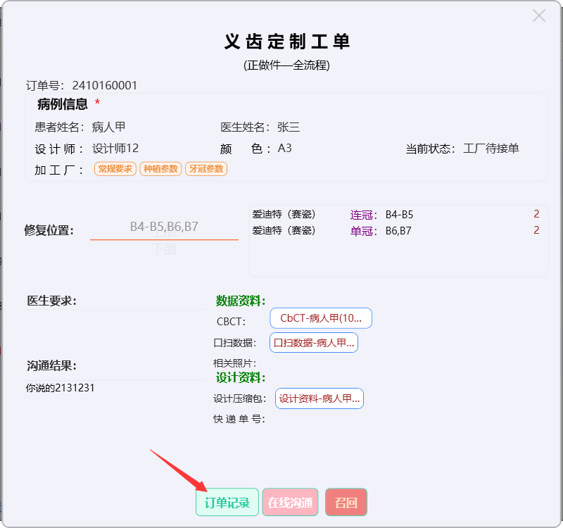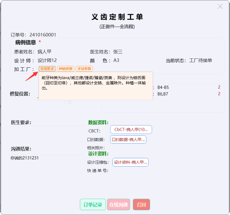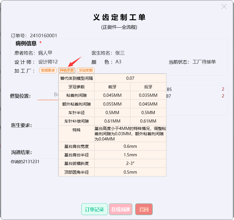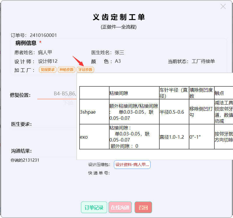 点击【牙冠参数】按钮,显示订单的牙冠参数。
