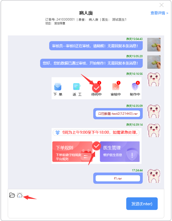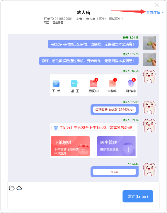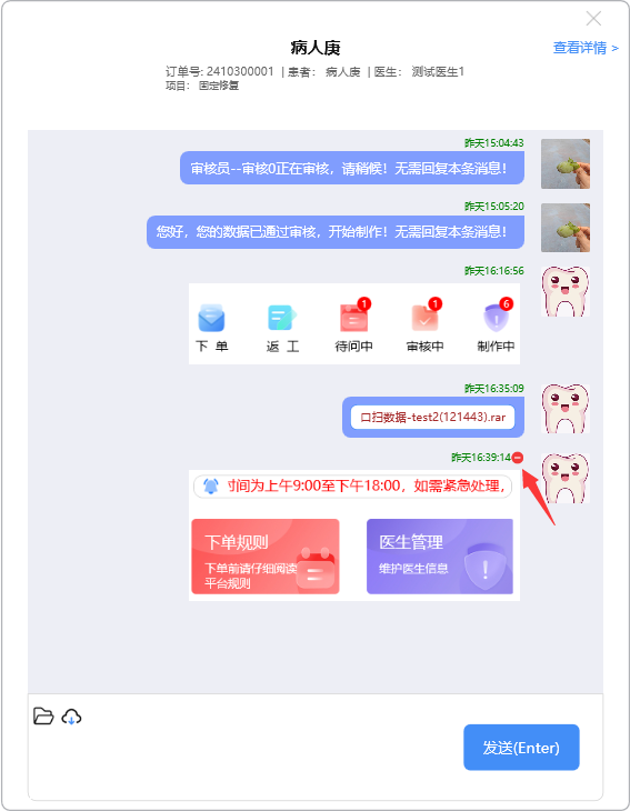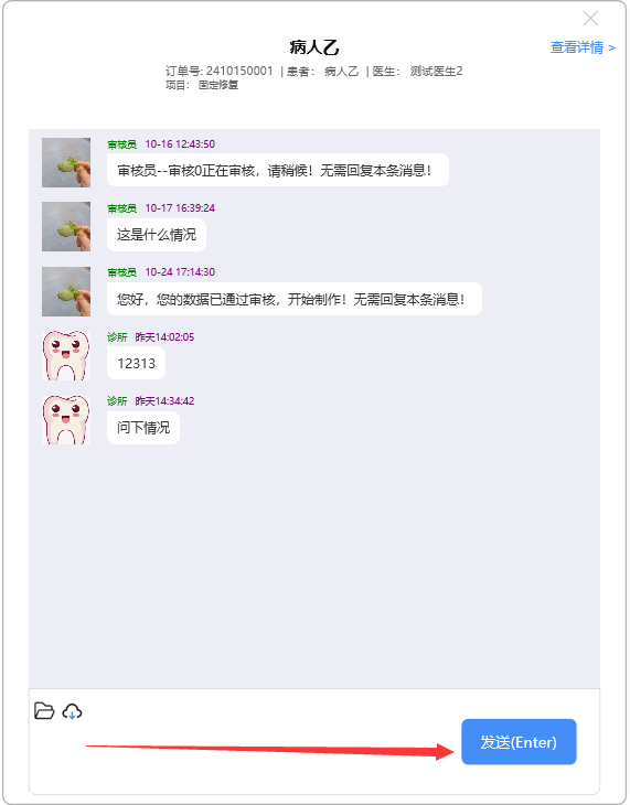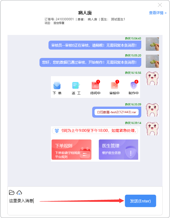 点开需阅读的消息记录,录入需要沟通的消息,点击【发送(Enter)】,或按Enter键,将消息发出: