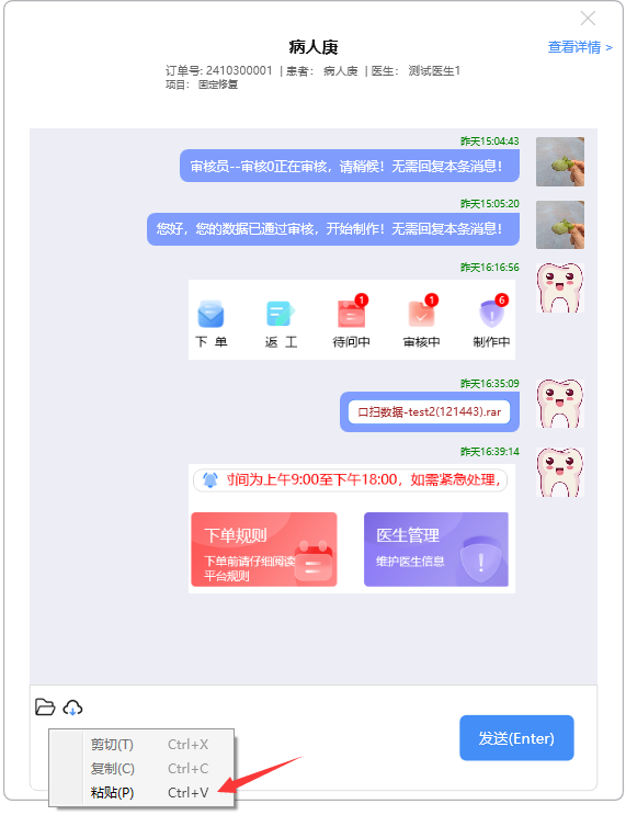 用系统工具截图后,右击录入消息框,点击粘贴,或者直接按CTRL+V粘贴,系统自动将图片上传至服务器: