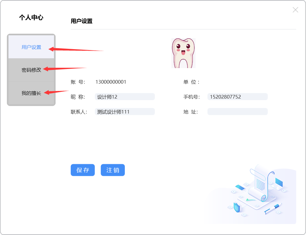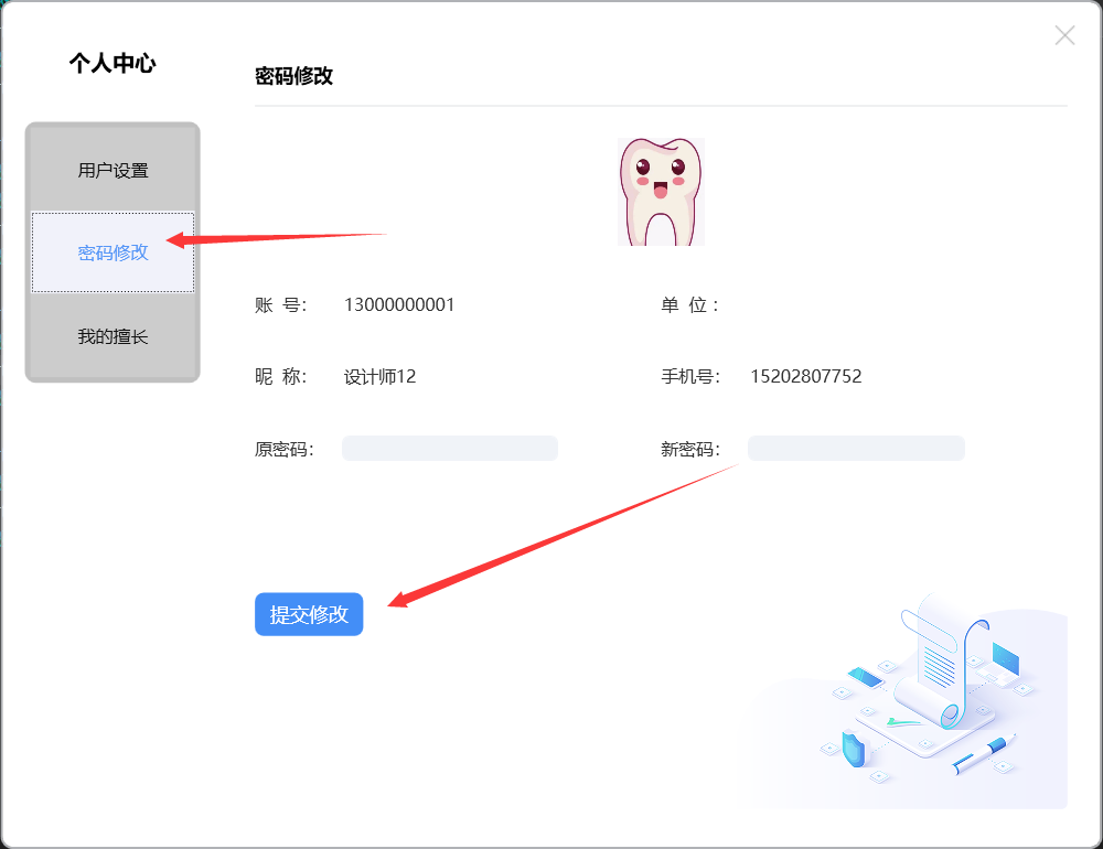 进入个人中心设置页面,可以进行用户设置、密码修改及我的擅长操作: