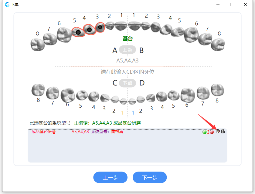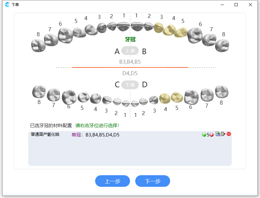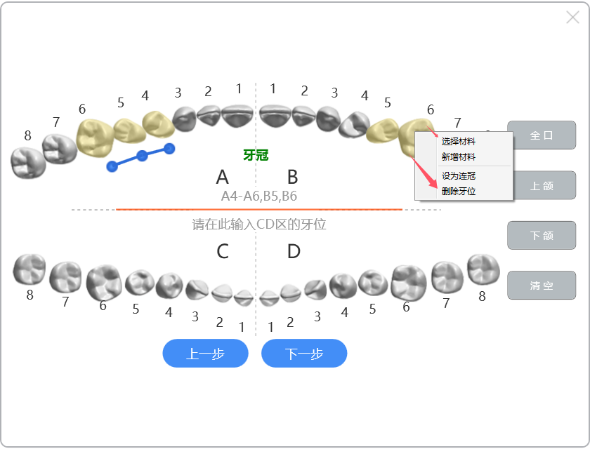 如果需要修改牙位材质,点击【上一步】,系统会回到牙位图的选择界面,方便修改。