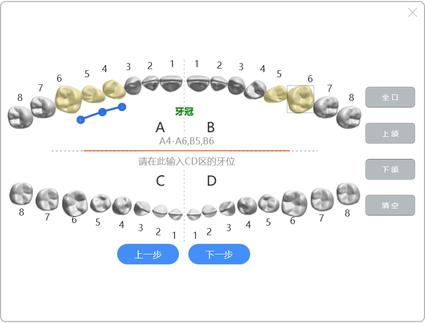 一是直接在红线上(上颌))或红线下(下颌)录入;录入规则说明:1代表A,2代表B,3代表C,4代表D,空格代表逗号,连冠用减号(-)连接。