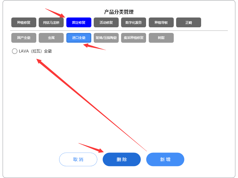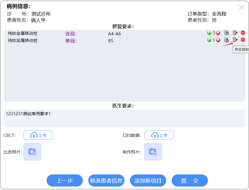确定好材质后,可点击选好的材质记录(该记录变红),然后可修改牙位数量,将连冠的记录中排除某牙位以及将该行记录修改或复制。