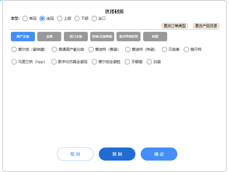 注意:点击【复制】,则会将当前牙位记录以当前材质新建一行记录;点击【确定】,则修改当前记录所有牙位的材质。