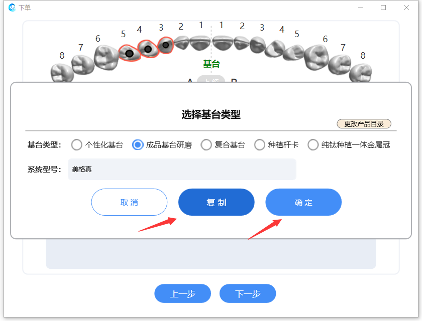 点击【下一步】,则系统进入牙冠的选择,操作方法请参见8.1、固定修复。若需修改复制种植牙位,则点击上面修改复制图标后,系统出现修改或复制界面,点击【确定】则修改相应信息,点击【复制】则会将此条基台记录复制。