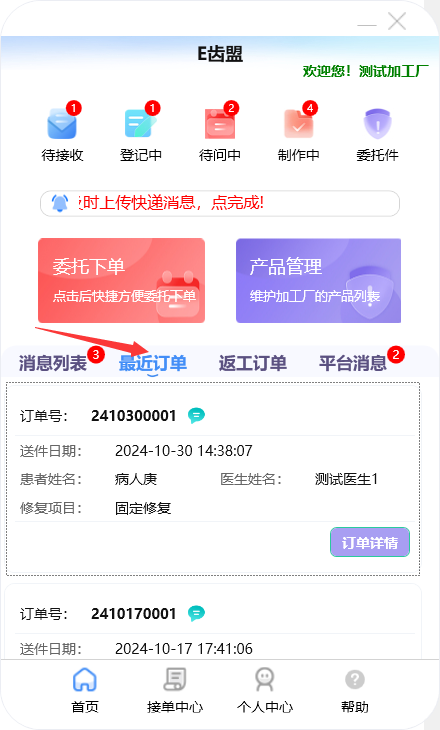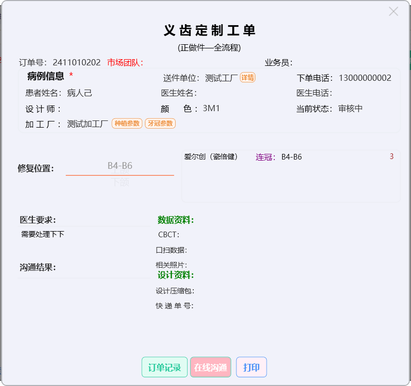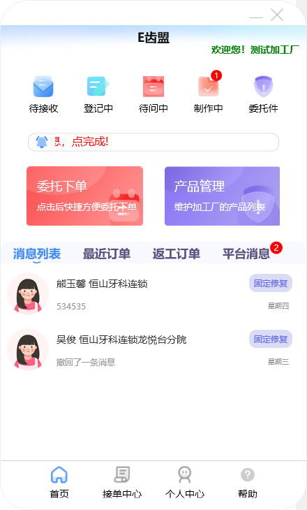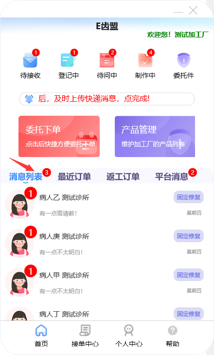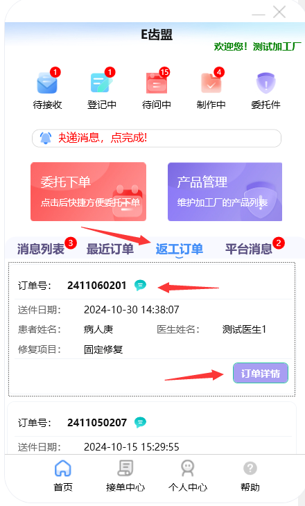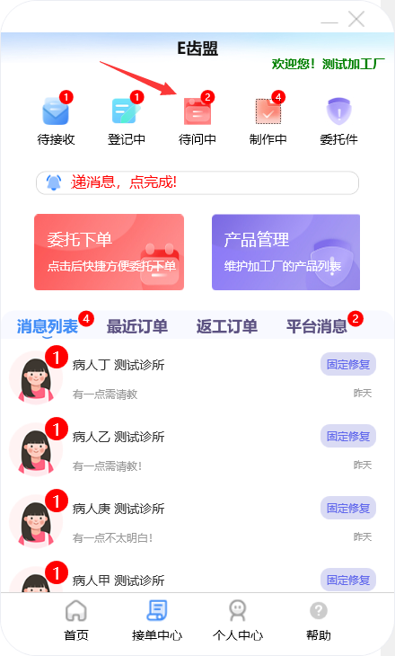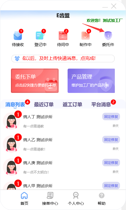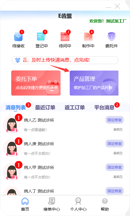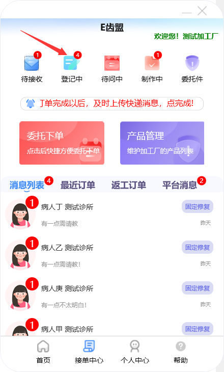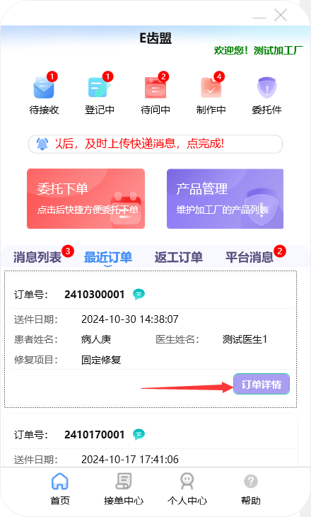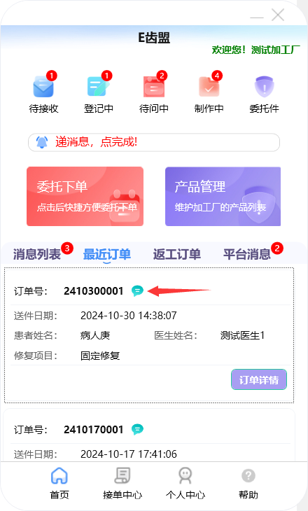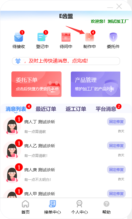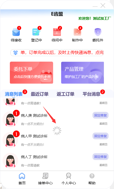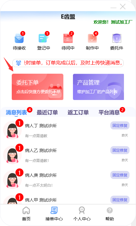 门户首页显示待问中、审核中、制作中的订单数量;查询系统公告;阅读下单规则;新建订单及下返工件;进行医生管理;查询订单消息;订单在线沟通及呼叫平台中心等功能。