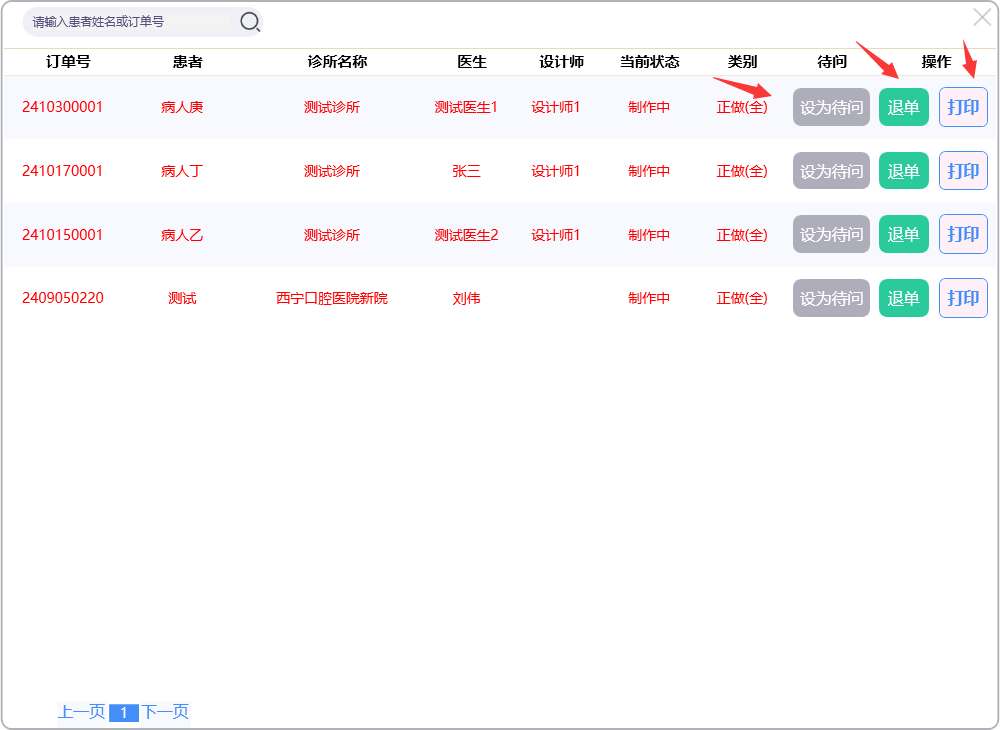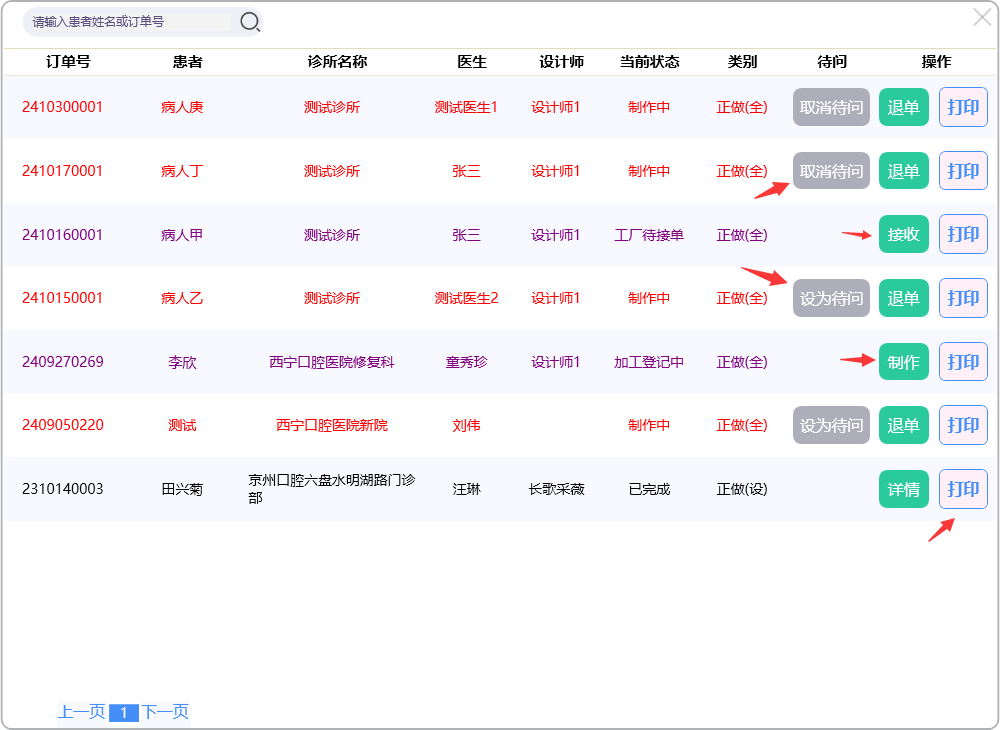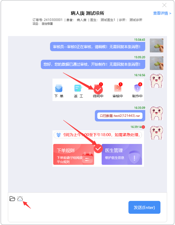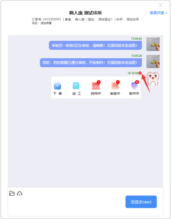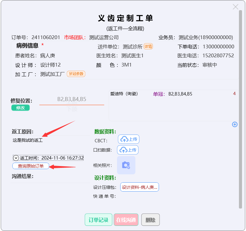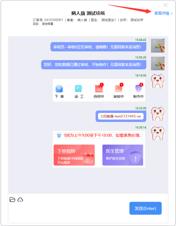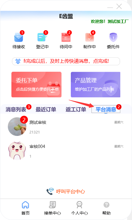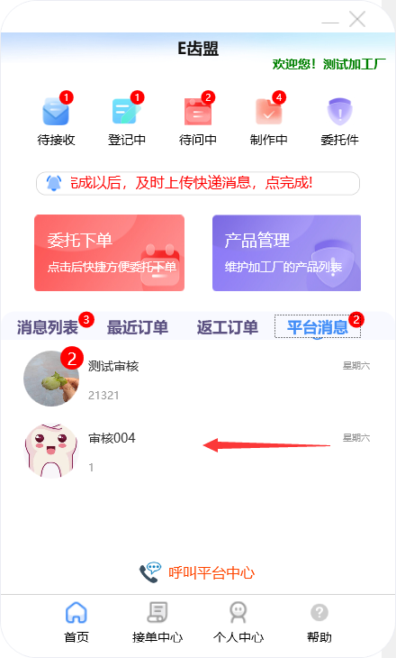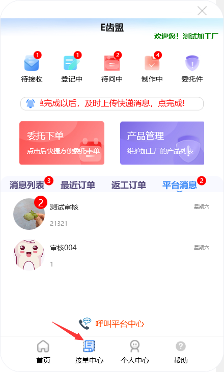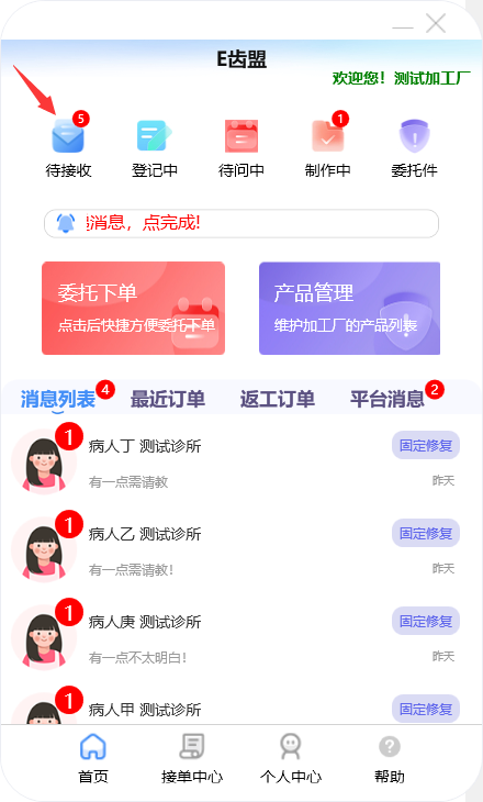 门户首页显示待问中、审核中、制作中的订单数量;查询系统公告;阅读下单规则;新建订单及下返工件;进行医生管理;查询订单消息;订单在线沟通及呼叫平台中心等功能。