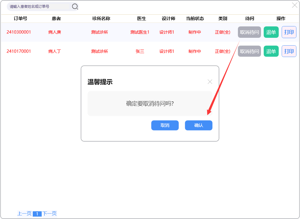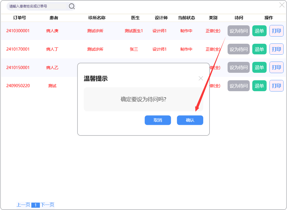 点击【设为待问】按钮,订单进入待问状态: