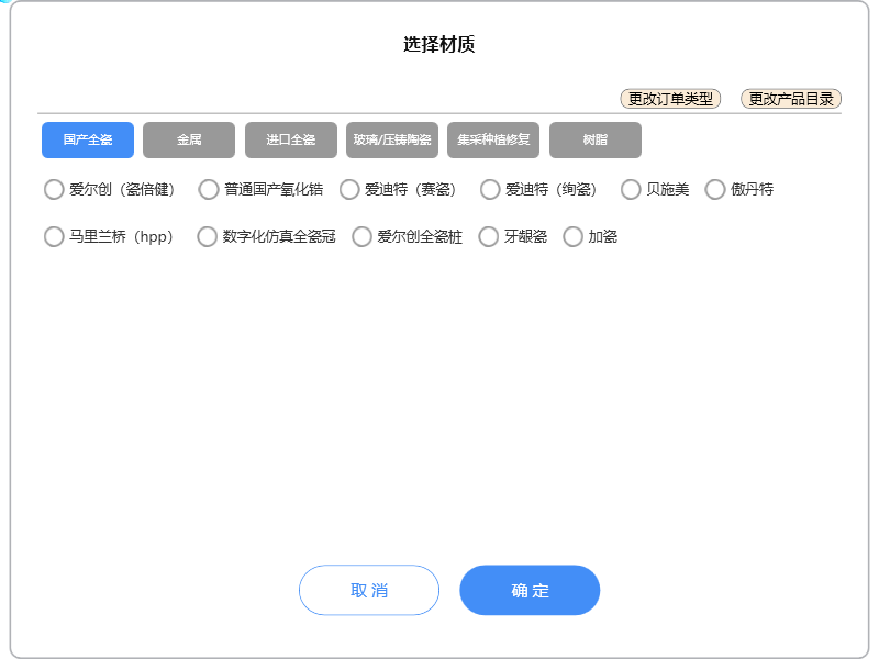注意:弹出选项中的【新增材料】适用于同一牙位有两种以上不同材质的方案。材质选择界面如下: