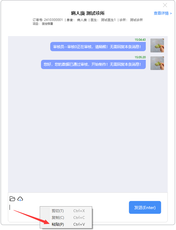 用系统工具截图后,右击录入消息框,点击粘贴,或者直接按CTRL+V粘贴,系统自动将图片上传至服务器: