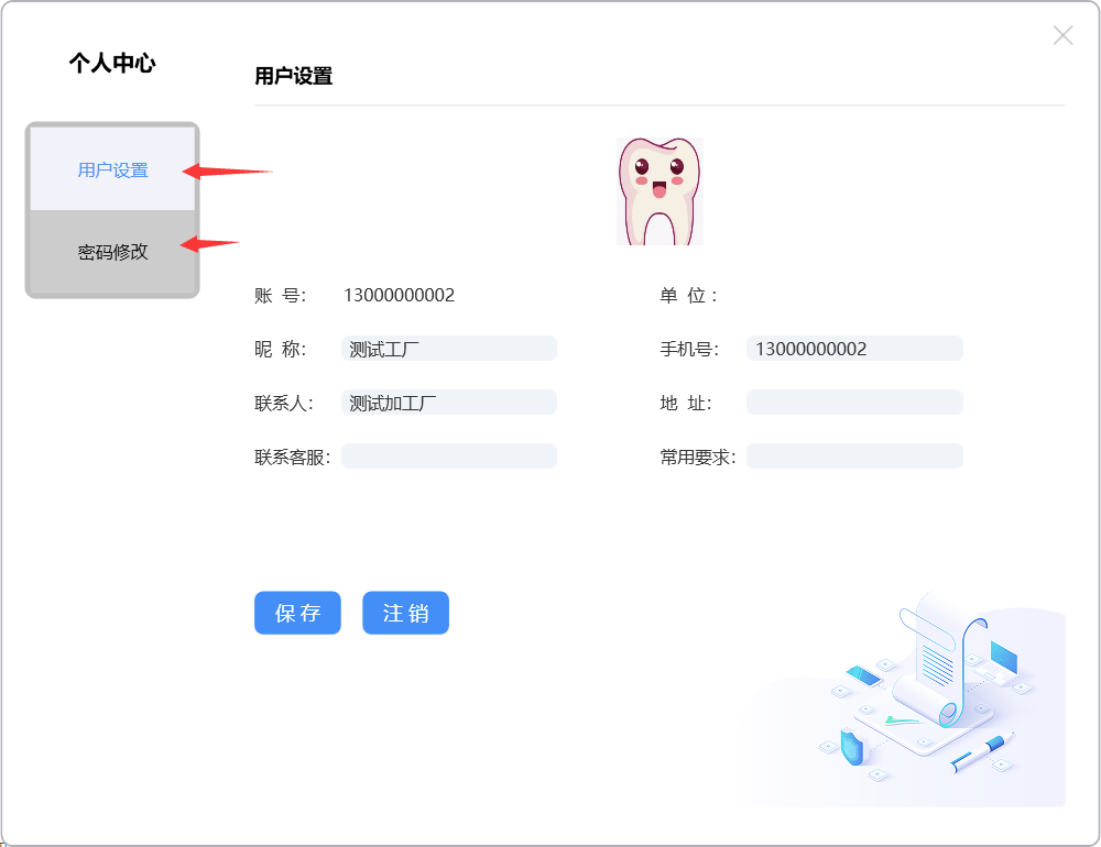 进入个人中心设置页面,可以进行用户设置及修改密码操作:
